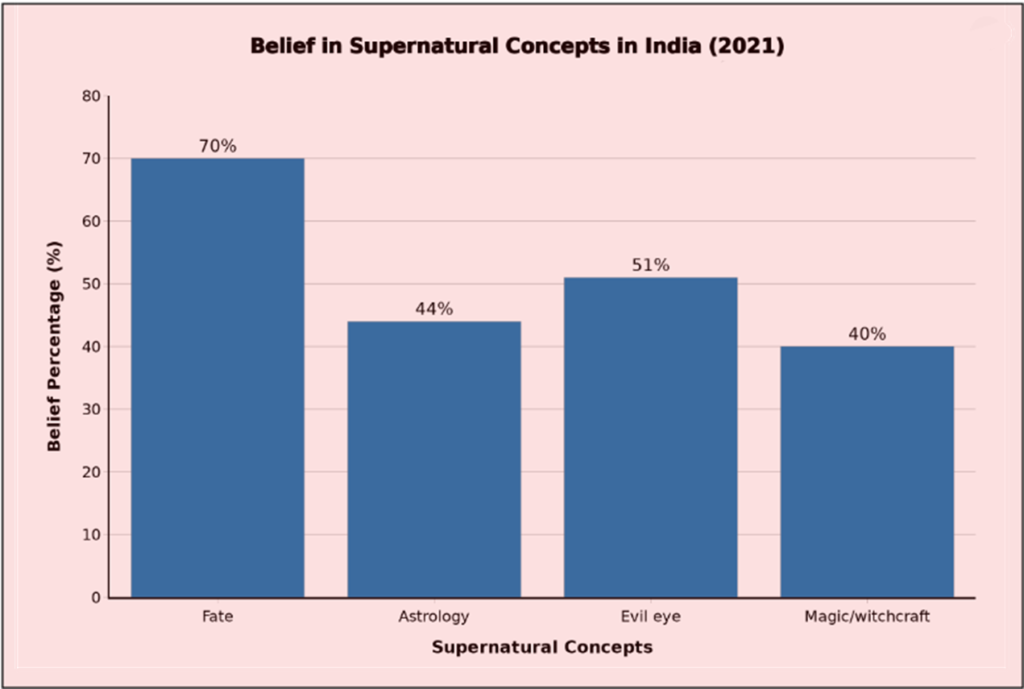 Of course, most Indians who follow superstitious practices would never consider violence. Still, national surveys reveal how widespread belief in unseen forces remains even in ordinary life. A 2021 study by the Pew Research Center found that about 70% of Indians believe in fate; 44% believe that astrology influences their lives; around 51% believe in the evil eye; and approximately 40% believe in black magic or witchcraft. Women, rural residents and people with lower formal education tended to report higher levels of such beliefs, but the numbers were significant across all groups. In other words, superstitions in India are not a marginal oddity sitting at the edges of society. It is woven into the mainstream, often overlapping with cultural practices that people cherish.