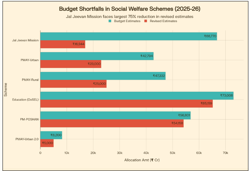 Budget Estimates (BE) sound definitive on Budget Day, but Revised Estimates (RE) reveal what actually happened mid-year. The most striking example is Jal Jeevan Mission (JJM): ₹66,770 crore (BE 2025–26) fell to ₹16,944 crore (RE) – a drop of nearly 75%. Housing shows a similar pattern: PMAY-Rural moved from ₹47,332 crore (BE) to ₹25,000 crore (RE) and PMAY-Urban from ₹42,794 crore (BE) to ₹23,000 crore (RE) – roughly 46–47% underspend in both. Put together, these gaps don’t just “delay projects”; they delay tap water, roofs, sanitation, and basic dignity – then they quietly push households back toward informal coping (debt, migration, unpaid care).